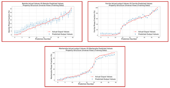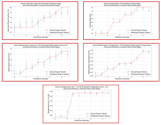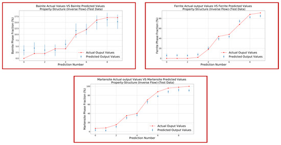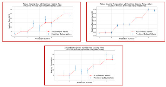 Step 3.2 Microstructure–Process Space (Heating Phase): The phase fraction % of martensite after forming and quenching is greatly affected by the phase fraction % of austenite. The formation of austenite during the heating phase is very influential upon the final properties of the product produced by hot stamping. The dataset for this step was obtained from [47], which involves the austenite phase fraction % as an input parameter, while the output parameters are heating rate HR, soaking temperature, and soaking time. The same process was followed as for previous steps with ANN parameters given in Table 4 for step 3.2. Figure 13 and Figure 14 present plots of the predicted output and actual output for both the input dataset and test dataset, respectively. The loss function for step 3.2 was calculated as shown in Table 12.
