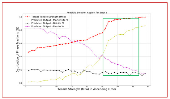 Step 2 Property–Microstructure Space: Step 2 has the target goals for material properties (hardness, tensile strength, and density) received from step 1. By exercising the ANN model in step 2 and exploring the solution space (using stage C of DSEF), the combinations for martensite, bainite, and ferrite phase fraction values are identified that satisfy the requirements for the material properties. These combinations are communicated to step 3.1 as design information.