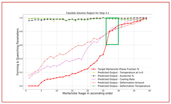 Step 3.2 Microstructure–Process Space: Following the same process and after exploring the solution space of heating phase parameters, the combinations of heating rate, soaking temperature, and soaking time are identified that satisfy the target goals of austenite phase fraction values.