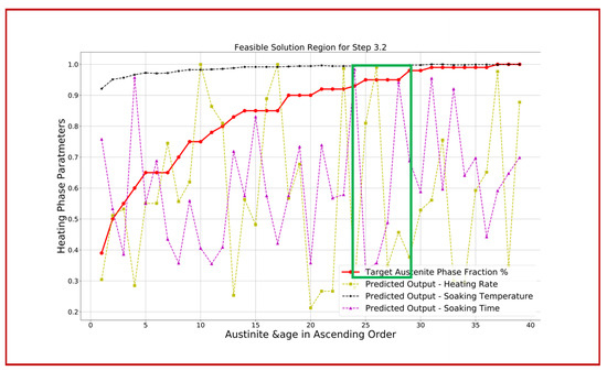 For solution space exploration, the requirements on the austenite phase fraction % are received from step 3.1 as shown in Table 13. The austenite phase fraction requirements are provided in the ranges. Upon mapping these requirements with the results for the ANN model, a feasible region is identified as shown by the green rectangular area in Figure 15. Following the same procedure as in the last step, a plot was drawn. The redline in Figure 15 represents the austenite phase fraction values for each processing combination of the heating phase. Austenite was selected because the target for the heating phase is always to achieve as much austenite as possible. From the feasible region, a set of feasible values of heating rate HR, soaking temperature, and soaking time were identified as shown in Table 14. These identified combinations of the processing parameters for the heating phase satisfy the austenite phase fraction requirements received from step 3.1.
