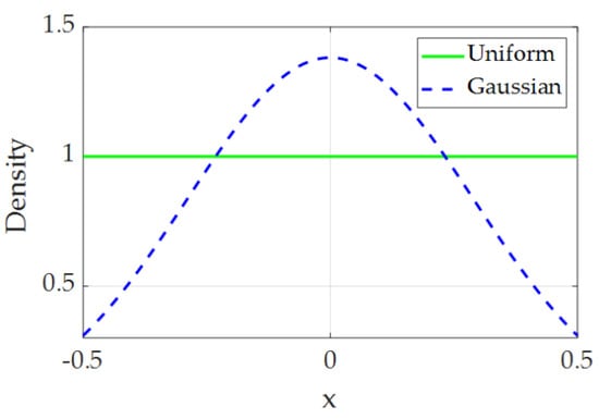 The Win and W are generated randomly and sparsely. For simplicity, they are usually generated in the same distribution form. Based on the practical guide to applying ESN [], the uniform distribution and Gaussian distribution are two popular distribution shapes. The uniform distribution is first performed for its continuity of values and boundedness. The distribution interval is [−0.5, 0.5], and the variance D(x) is calculated as 1/12. When the Gaussian distribution has the same variance as uniform distribution, the weight matrix follows the normal distribution N (0, 1/12) []. The probability density functions of uniform distribution and Gaussian distribution are shown in Figure 1.