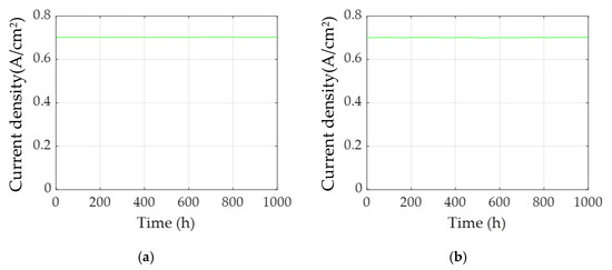 In the dynamic operating condition, the RPLR is used as the degradation health indicator, which has been described in detail in our previous work []. First, the polarization curve of the PEMFC stack at the beginning of life (BoL) is measured. The BoL power at different currents can be calculated to form a table. Secondly, the power at time step t can be calculated by the measured current (It) and voltage (Ut). Finally, the RPLR at time step t is calculated by