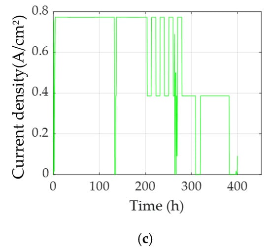 Three degradation datasets under different operation conditions are used for exploring the prediction effects of two distribution shapes of weight matrices, testing the performance improvements of the ensemble ESN, and statistically analyzing the uncertainty of random matrices. The steady-state and quasi-dynamic datasets come from the open data of the 2014 Prognostic and Health Management Data Challenge []. Two PEMFC stacks are used for the 1000 h duration test under the steady-state and quasi-dynamic operating conditions. There are 5 cells for both stacks, and their active area is 100 cm2, the operating temperature is 80, and the back pressure is 0.2 MPa. For the steady-state test, the constant current is 70 A. For the quasi-dynamic test, the current ripples (7 A) at different frequencies (from 50 mHz to 10 kHz) are superimposed to the constant current (70 A) for the electrochemical impedance spectroscopy (EIS) measurement. The third dataset comes from a PEMFC stack for 382 hours’ duration test under the dynamic μ-CHP load profile. The current has a cycle between 170 A and 85 A. The stack consists of 8 cells, and the active area is 220 cm2, the operating temperature is 80, and the back pressure is 0.15 MPa []. The load profiles of the three tests are shown in Figure 3.