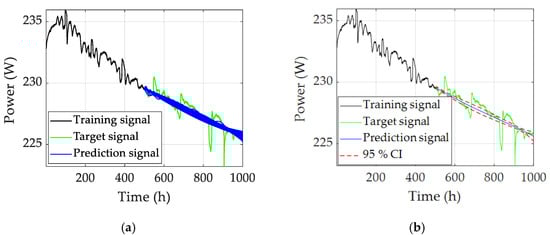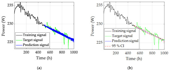 In the steady-state operating condition, the stack output power is used as the degradation health indicator. Half of the data (0–500 h) is used for training the ESN, and the rest of the data (501–1000 h) is used for prediction. During the prediction procedure, 100 individual ESNs have 100 groups of prediction results. Then, the mean value, variance, and 95% CI of the predicted results can be calculated at each time step. When Win and W follow the uniform distribution, the RUL prediction results are shown in Figure 4. Taking the first 10 groups of ESNs as an example, their hyperparameters and RMSE are shown in Table 1.