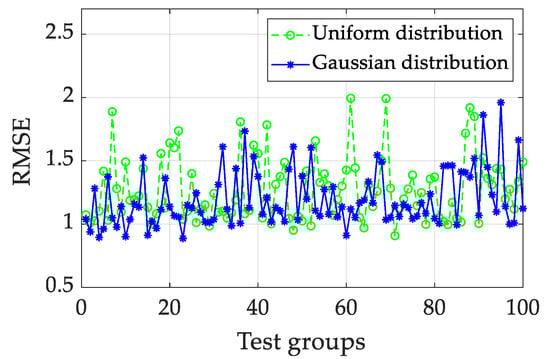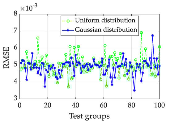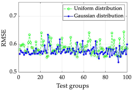 To analyze the effects of the two matrices’ distribution shapes of Win and W on the prediction accuracy, the RMSE of 100 groups of ESNs is shown in Figure 9. The average RMSE under the Gaussian distribution (1.19634) is lower than the average RMSE under the uniform distribution (1.27562) for the quasi-dynamic test. The mean prediction results of the ensemble ESN are calculated, i.e., 0.95657 for uniform distribution and 0.90618 for Gaussian distribution.