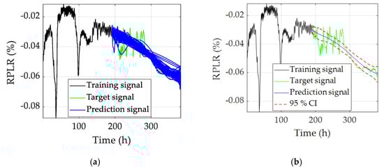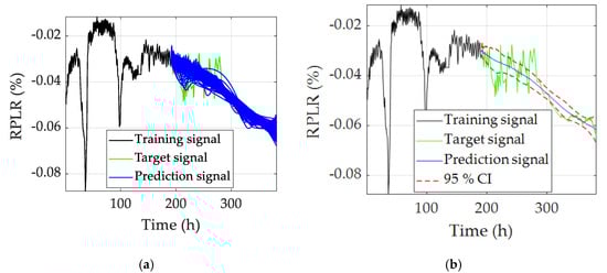 Based on the ANOVA analysis results of [], a multi-reservoir ESN structure is proposed in [], and each reservoir has a different spectral radius. This multi-reservoir ESN can avoid the optimization of the spectral radius, and its effectiveness is validated under the steady-state cell voltage prediction condition. As an extension of the work in [], the ESN and Markov chains are combined to predict the cell voltage under the dynamic micro-combined heat and power (μ-CHP) load profile []. The RUL prediction by the combined structure can be realized with a mean relative accuracy below 17%. An ensemble ESN network has recently been proposed to avoid hyperparameter optimization and improve the adaptiveness of lifetime prediction []. A dynamic health indicator of “virtual steady-state voltage (VSV)” is proposed based on linear parameter varying (LPV) models. Then, a number of ESNs with different combinations of hyperparameters (leaking rate and spectral radius) are used for the VSV prediction. Finally, the long-term RUL prediction and a confidence interval of 95% confidence level are given in detail. In the past two years, the multi-input ESN structure is proposed to improve the prediction accuracy of the RUL [,,,]. The effects of the operating parameters (i.e., current, temperature, and pressure) are fully analyzed under the steady-state and dynamic operating conditions in [,] separately. The multi-input ESN structure could improve the prediction accuracy regarding the health indicator and the scheduled current as the double inputs are more meaningful in practice. In ref. [], the ambient temperature and stack voltage are used as the double inputs of ESN to improve the RUL prediction accuracy. The normalized root mean square error is equal to 0.098 with a prediction over 2000 h. In ref. [], the input parameters of ESN are evaluated and selected by the least absolute shrinkage and selection operator (LASSO), and then the degradation-related parameters are used for the RUL prediction. Results show that the ESN with eight input parameters is the optimal choice. Both [] and [] are validated by the steady-state datasets.