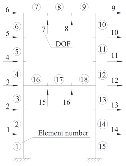 As shown in Figure 1, a finite element model of a two-story rigid frame structure is adopted in this study. The height and width of each layer of the rigid frame is 1.41 m. The total element number of the structure is 18 and the degrees of freedom number (DOF) is 16. The structural physical parameters of the beam and the column are listed in Table 1.