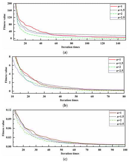 Table 2 tabulates the mean optimal function value of the three criterion functions with different values of parameter a. Figure 2 shows the influence of parameter a on the SIPSO algorithm. As shown in Table 2, with the Rosenbrock criterion function, the parameter a = 2 corresponds to the optimal function value. As shown in Figure 2a, with the Rosenbrock criterion function, the convergence curve of parameter a = 2 is located at the bottom and converges rapidly, which is obviously better than other values. When the Rastrigin criterion function is adopted, the parameter a = 2 also corresponds to the optimal function value, and the convergence curve of parameter a = 2 is much better than other values, as shown in Table 2 and Figure 2b. As shown in Table 2, with the Griewank criterion function, the parameter a = 2.5 corresponds to the optimal function value and the parameter a = 2 corresponds to the second-best function value. As shown in Figure 2c, with the Griewank criterion function, when the number of generations is less than 50, the convergence curve of parameter a = 2 is located at the bottom and converges rapidly, which is better than other values. In addition, when the number of generations is more than 50, the convergence curves of parameter a = 2 and parameter a = 2.5 are very close and it is hard to tell which one is better.