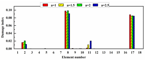 Structural damage detection results under different values of parameter a of the SIPSO algorithm. (Double damages with 10% damage index under 10% noise level).