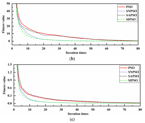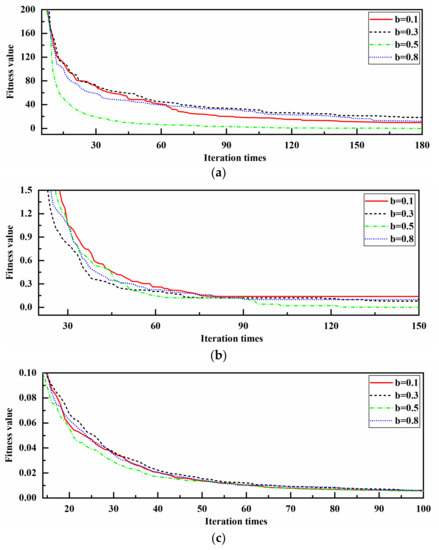 Table 3 tabulates the mean optimal function value of the three criterion functions with different values of parameter b. Figure 4 shows the influence of parameter b on the SIPSO algorithm. As shown in Table 3, with the Rosenbrock criterion function, the parameter b = 0.5 corresponds to the optimal function value. As shown in Figure 4a, with the Rosenbrock criterion function, the convergence curve of parameter b = 0.5 is located at the bottom and converges rapidly, which is obviously better than other values. When the Rastrigin criterion function is adopted, parameter b = 0.5 also corresponds to the optimal function value and the convergence curve of parameter b = 0.5 is much better than other values, as shown in Table 3 and Figure 4b. As shown in Table 3, with the Griewank criterion function, parameter b = 0.3 corresponds to the optimal function value and parameter b = 0.5 corresponds to the second-best function value. As shown in Figure 4c, with the Griewank criterion function, when the number of generations is less than 50, the convergence curve of parameter b = 0.5 is located at the bottom and converges rapidly, which is better than other values. In addition, when the number of generations is more than 50, the convergence curves of parameter b = 0.3 and parameter b = 0.5 are very close and it is hard to tell which one is better.