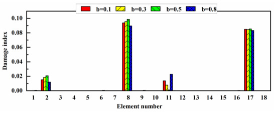 Figure 5 shows the structural damage detection results under different values of parameter b of the SIPSO algorithm. There are two damaged sections, namely element 8 and element 17. The damage index is set as 10% and the noise level is also set as 10%. As shown in Figure 5, the SIPSO algorithm with four values of parameter b can accurately identify the damage location and degree of damage in element 8 and element 17, but the misjudgment results of each parameter are different. When the values of parameter b = 0.1, b = 0.3, and b = 0.8, there are two misjudged-as-damaged sections. When parameter b = 0.5, there is only one misjudged-as-damaged section and the identification result is the best among the four parameters. After comprehensively considering the results of the three criterion functions and structural damage identification, parameter b = 0.5 is selected as the optimal parameter b of the SIPSO algorithm. In this subsection, the optimal parameter a is adopted by default.