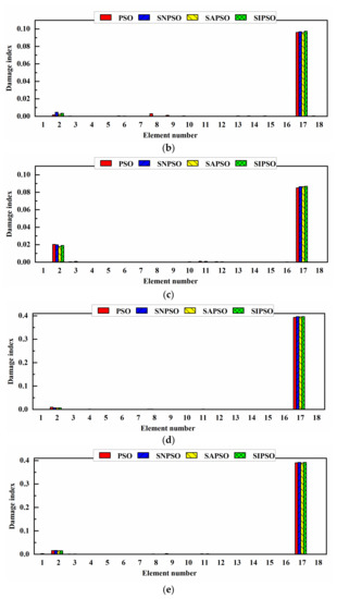 As shown in Figure 7b, when the damage index is set as 10% and the noise level is set as 5%, the PSO algorithm can identify the damage at element 17 except for three misjudged-as-damaged sections at element 2, element 8, and element 9. On the contrary, the identification results of the SNPSO, the SAPSO, and the SIPSO algorithm are much better with only one misjudged-as-damaged section at element 2.