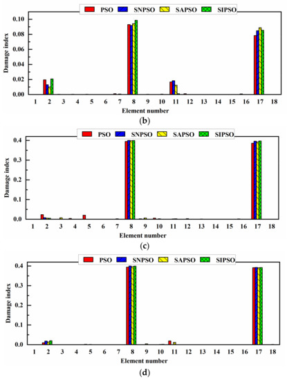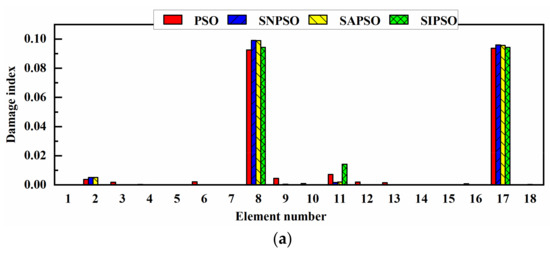 As shown in Figure 8a and Table 6, when the damage index is 10% and the noise level is set as 5%, the PSO algorithm can identify the damages at element 8 and element 17 except for seven obvious misjudged-as-damaged sections. In this condition, the SNPSO algorithm has two misjudged-as-damaged sections and the SAPSO algorithm has three misjudged-as-damaged sections. The identification result of the SIPSO algorithm is the best, with only one misjudged-as-damaged section at element 2.
