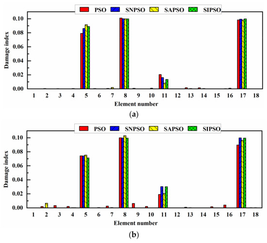 As shown in Figure 9b, when the damage index is set as 10% and the noise level is set as 10%, the PSO algorithm can identify the damages at element 5, element 8, and element 17 except for ten misjudged-as-damaged sections. In this condition, the SAPSO algorithm has four misjudged-as-damaged sections. The identification results of the SNPSO algorithm and the SIPSO algorithm are the best with only one misjudged-as-damaged section at element 11.
