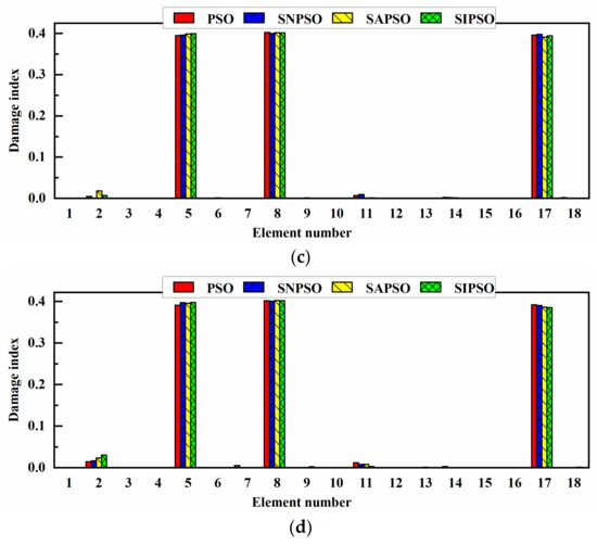 As shown in Figure 8c, when the damage index is set as 40% and the noise level is set as 5%, the PSO algorithm and the SAPSO algorithm can identify the damages at element 8 and element 17 except for three misjudged-as-damaged sections. The SNPSO algorithm and the SIPSO algorithm are the best with only one misjudgment element. As shown in Figure 8d, when the damage index is set as 40% and the noise level is set as 10%, the PSO algorithm and the SAPSO algorithm have three misjudged-as-damaged sections, and the SNPSO algorithm and the SIPSO algorithm have one misjudged-as-damaged section.