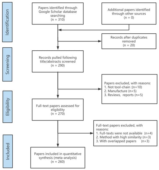 As shown in the PRISMA flow specification in Figure 1, through inclusion criteria and exclusion criteria, 260 papers were selected for the final analysis from Google Scholar.