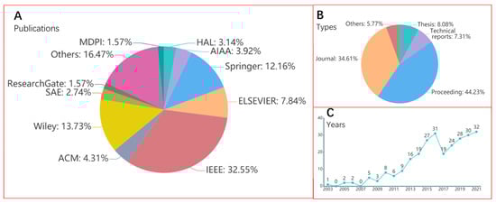 In Figure 2A, the publishers of each paper are analyzed, including the American Institute of Aeronautics and Astronautics (AIAA), the Association for Computing Machinery (ACM), Elsevier, HAL, the Institute of Electrical and Electronics Engineers (IEEE), Wiley for the International Council on Systems Engineering (INCOSE) publication, the Society of Automotive Engineers (SAE), Springer, Multidisciplinary Digital Publishing Institute (MDPI), and other publishers (referring to the source on the Web), such as universities that publish technical reports or theses. Most of the papers were from the IEEE (Figure 2A), and approximately 14% of the papers were from Wiley. Moreover, approximately 44% of the papers were published for conferences, and approximately 35% of the papers were from journals (Figure 2B). The publication years, shown in Figure 2C, show the changes in the number of MBSE tool-chain papers from 2003 to 2021.