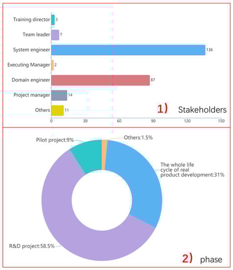RQ 2 aims to understand the application areas of MBSE tool-chains. Two main aspects were considered: (1) the stakeholders’ roles that the papers contribute to, and (2) the development phases that the papers contribute to, which were both estimated by review and analysis. The results in Figure 3 demonstrate that most of the papers were contributed by system engineers and domain engineers, and approximately 58% of the papers contributed to R&D projects.