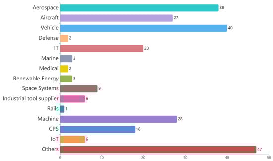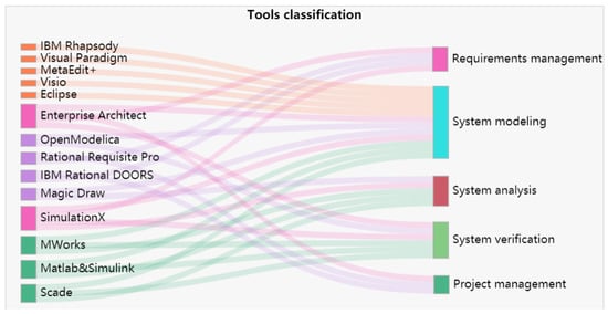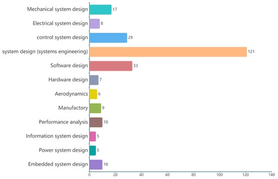 Based on the results shown in Figure 4, aerospace and vehicles were the two domains to which the papers contributed most. Moreover, approximately 47 papers were not covered by the given domains. Figure 5 introduces the functionalities of MBSE tool-chains. In our terminology, system design and development based on systems engineering are defined collectively as “system design”, which is the area that most of the developed tool-chains support.