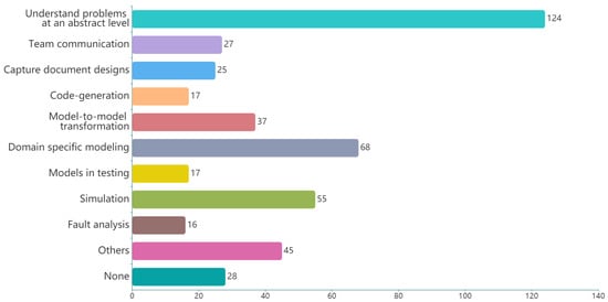 The studies were surveyed to understand the purpose of the models, as perceived by each author. Ultimately, when reviewing such papers, multiple purposes emerge; however, the results demonstrate that understanding problems at an abstract level is the most important modeling purpose, as shown in Figure 7.