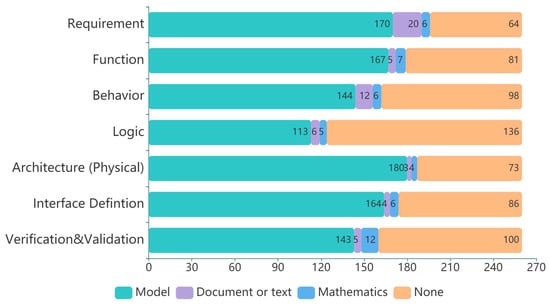 Each study was analyzed to investigate which perspectives of system artifacts are formalized, including requirements, function, behavior, logic, physical architecture, interface definition, and verification & validation. Moreover, three types of formalisms were considered: (1) models; (2) mathematics; and (3) text. The results shown in Figure 8 demonstrate that system artifacts were formalized as specific models rather than text or mathematics. The requirements were the most frequently mentioned perspective formalized using models.