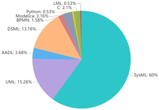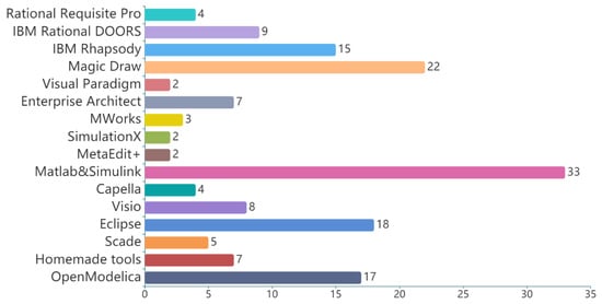 As shown in Figure 7, Figure 8, Figure 9, Figure 10, Figure 11, Figure 12, Figure 13, Figure 14, Figure 15 and Figure 16, we analyzed the technical aspects of the MBSE tool-chains to support system development, including modeling purposes, modeling languages, modeling methods, etc. Figure 7 demonstrates that understanding problems at an abstract level is the most common purpose of tool-chains. As shown in Figure 8, the formalisms of requirement, function, behavior, logic, physical architecture, interface definition, and verification & validation are used to understand the system problems at the abstract level. As the most frequently researched aspect, the requirement not only needs to tell system engineers what the system needs to do, but also needs to improve the traceability of design problems through verification [29,30]. Figure 9 shows that SysML [31] is widely used in terms of modeling languages. As for modeling methods, due to the ability of abstract system architectures, meta-modeling is widely used in MBSE, as shown in Figure 10. Simulation is an important part of system design; therefore, simulation methods are widely used in MBSE tool-chains. Only about half of all the papers included simulation in their tool-chain, as shown in Figure 11. From the perspective of modeling tools in Figure 12, MATLAB and Simulink were the most widely used tools in tool-chains. As a visual simulation tool, Simulink provides a graphical editor, a customizable module library, and a solver which can perform dynamic system modeling and simulation. As seen in Figure 14, a limited number of articles mentioned integrated verification; Modelica, the integrated simulation based on commercial tools, and commercial tools for co-simulation were the main approaches to support integrated simulation.