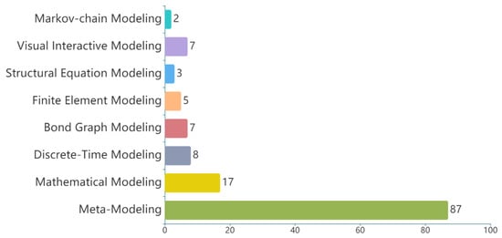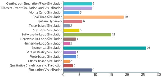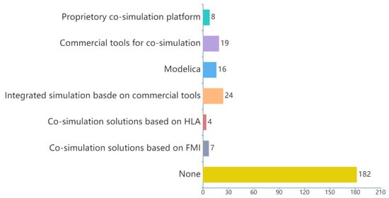 Modeling and programming languages were also investigated in these papers. From the results in Figure 9, SysML was found to be the most widely used language in the tool-chains proposed in the studies. In addition to modeling languages, modeling methods (i.e., how to model) were investigated. Figure 10 shows that meta-modeling was the most widely used approach. Apart from modeling methods, simulation methods were also investigated. Among simulation methods, Figure 11 shows that the numerical simulation method was more general than other methods.