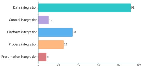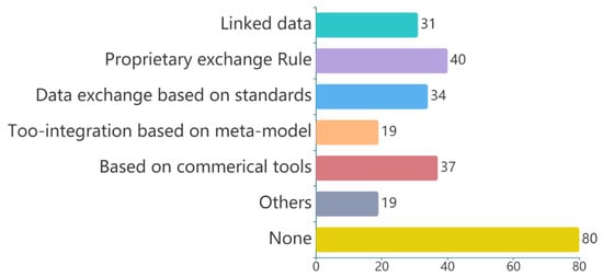 Tool integration is an important technical aspect for developing MBSE tool-chains. We investigated five types of tool integration: (1) data integration, referring to data sharing and the relevant complexity management among data in different tools; (2) control integration, providing tool operations to notify and activate other tools; (3) platform integration, providing a virtual operation environment for integrating tools; (4) process integration, referring to integration of process management, development operation, and data configuration; and (5) presentation integration, providing a unified and formal representation of user interfaces [19]. As shown in Figure 15, data integration was the most frequently used for tool integration. Moreover, tool integration solutions were analyzed to identify which techniques were widely used in these studies. From the results, most of the tools were found to be integrated using proprietary exchange rule data exchange based on standards, as shown in Figure 16.