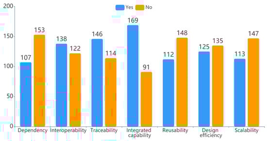 Figure 17 evaluates the metrics of the MBSE tool-chains. The results show that the metrics of integrated capability, interoperability, and traceability are mentioned in more than 130 papers. The integration capability is the tool-chain’s function for managing the tools’ interconnections, interfaces, relationships and dependencies, and the processes of requirement management, architecture design, interface definition, and verification & validation. Integration capability increases the automation of system development; for example, mathematical simulation tools and system modeling tools were integrated to support automatic verification in control systems [35]. Moreover, integration capability improves design efficiency, as, for instance, in a model-driven embedded system design flow integrating the SysML and SystemC-UML profiles to realize hardware–software co-design [36]. In addition, integration capability is also important for system analysis; for example, a novel approach was presented to address functional safety requirement verification, in which the authors integrated functional tests as full-fledged components into a model-based architecture using OpenModelica [24].