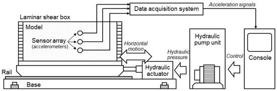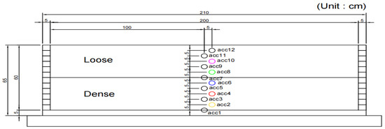 In this study, the amplification characteristics of acceleration have been investigated for the flat ground model with multilayered soils. The cross-section and accelerometer location of the model ground created in this experiment are illustrated in Figure 4. The two layers consisted of loose and dense ground, respectively, and the height of each layer was 0.3 m. The upper ground was formed relatively loosely with a unit weight of 14.72 kN/m3 using sampling soils, and the lower ground was densely formed with a unit weight of 19.6 kN/m3 using mixing samples. In order to confirm the change in the amplification characteristics between the two layers, accelerometers were buried 5 cm apart from the ground floor to the surface at the center, which was considered to best simulate the free field behavior. However, if the accelerometer is buried on only one axis at an interval of 5 cm, the gap between the instruments is too short to disturb the ground or measure distorted signals. Therefore, it was alternately buried on two axes, 5 cm away from the center axis and center axis.