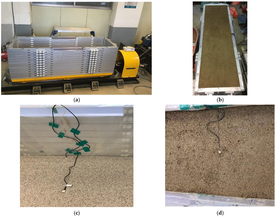 Laminar shear box: (a) Empty Laminar shear box in this study; (b) Soil sample set up in the LSB; (c) Accelerometer set up for a dense layer; (d) Accelerometer set up for a loose layer.