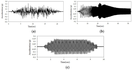 The input seismic wave was selected from the sine wave, sine sweep wave, and artificial seismic wave. As sine wave signals, the 10 Hz signals corresponding to the Peak ground acceleration of 0.2 g were used to confirm the basic characteristics of the flat model. A simple long-period sine 10 Hz wave was chosen so that resonance would not occur due to the natural period of the shaking table or box. The artificial seismic wave is a composite seismic wave combined with the Gyeongju-Pohang earthquake, using the empirical Green’s function based on raw data measured at the Kori nuclear power plant. Since artificial seismic waves have different periodic components, high amplification occurs. There is also a sine sweep wave that provides waves containing any frequency from low to high frequencies. Seismic motion includes waves of various frequency bands from low to high frequencies. They are used to determine amplification characteristics that resonate with the natural frequencies of the ground. The acceleration-time history of the input seismic wave shaking table test above is shown in Figure 5.