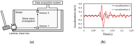 The shear wave velocity is usually used to characterize the dynamic property of soil in geotechnical engineering, and the importance of shear wave velocity in geotechnical seismic engineering has been widely recognized and applied in seismic design and seismic performance evaluation [14]. The average shear wave velocity of the model was obtained by substituting the difference between the distance between the two accelerometers buried in the ground and the arrival time of the shock wave into the velocity formula by giving an impact to the lower part of the soil box in Equation (1). Figure 6 shows the shear wave velocity measurement method used in this study.