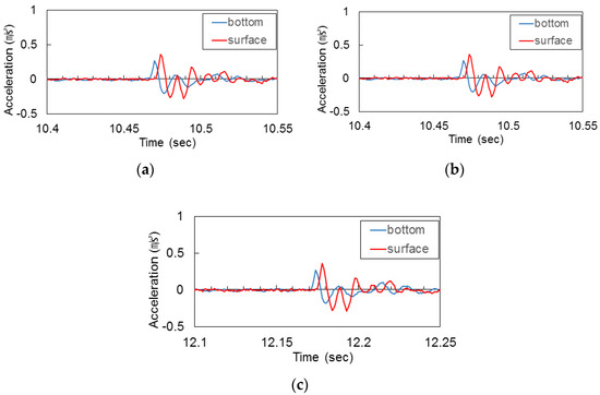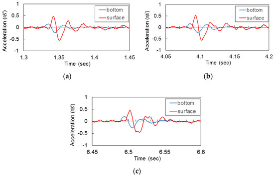 Figure 8 shows the acceleration-time history of the multilayered lower ground (dense ground) as a single layer ground with a thickness of 0.6 m, and the hammer test was performed by embedding an accelerometer in the bottom and surface layers of the soil. The average shear wave velocity of the layer was determined using the time difference between the first peaks and the distance between the buried accelerometer; the average shear wave velocities obtained by repeating the hammer test were 139.80 m/s, 138.74 m/s and 133.96 m/s, and the average value of 137.5 m/s was determined as the average shear wave velocity of the dense ground.