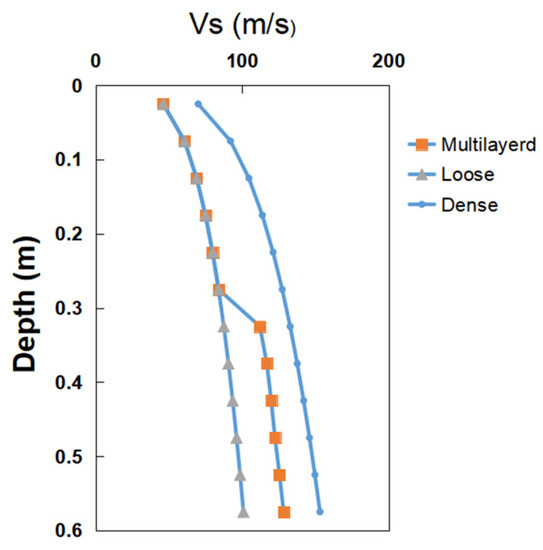 The shear wave velocity modulus of loose ground and dense ground formed by stratification was applied as shown in Figure 9.