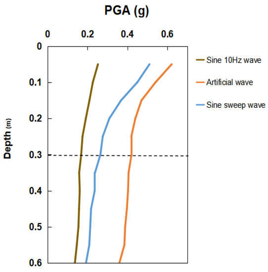 To evaluate the amplification characteristics of the multilayered flat model ground, the peak ground acceleration (PGA), spectral acceleration (SA), and amplification factor for the three input seismic waves were analyzed. Figure 10 shows the PGA by depth measured at the center of the flat, multilayered ground model. Under the three waveforms, the depth range of 0.3–0.6 m is dense ground, and the peak ground acceleration changes little with the decrease in depth. The depth range of 0–0.3 m is loose ground, and the peak ground acceleration increases obviously with the decrease in depth. Among them, the Sine 10 Hz wave does not show a steep shape even on the upper ground, because it is different from the natural period of the ground and cannot generate resonance. Artificial seismic waves and the sine wave resonate in the upper ground.