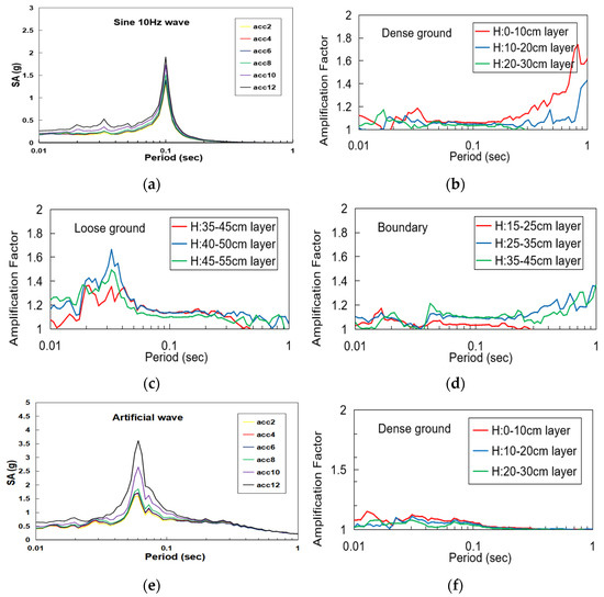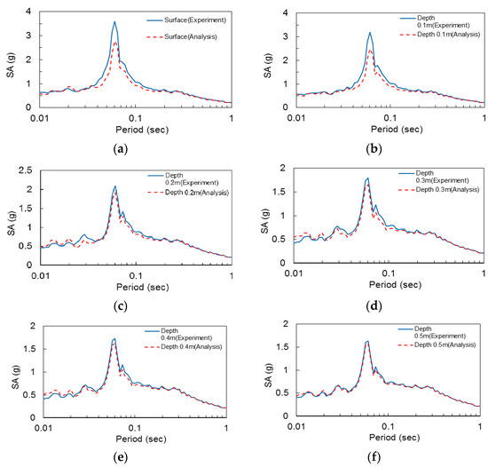 Figure 15, Figure 16 and Figure 17 present the spectral acceleration amplification for the same input wave at different depths. Figure 15 exhibits the sine wave of each layer at 10 Hz between experiment and numerical analysis comparisons. As the depth is close to the surface, the value of spectral acceleration increases. Figure 15a–c shows that, from a depth of 0.2 m from the surface, as the height increases, the difference between the experimental results and the numerical analysis results keeps increasing and the SA of the experiment is always greater than that of the numerical analysis result. Figure 15d–f shows that the difference between the experiment results and the numerical analysis results is very close with a depth of 0.3 m.