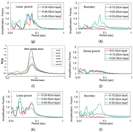 Figure 11 represents the depth-specific response spectral and response spectral amplification coefficients of the multilayered, flat ground model. The amplification factor showed the degree of amplification within 10 cm thickness by dividing the soil layer into 10 cm intervals for detailed identification. Figure 11a–l present the experimental results for the sine 10 Hz wave, the artificial seismic wave, and the sine sweep wave, respectively. Figure 11a,e,i show response spectral acceleration, and it can be seen that the acceleration is amplified according to the vertical height. Figure 11c,g,k are the response spectral amplification coefficients of the upper ground, and it was confirmed that in the loose ground, the amplification was about 1.5 times for each layer thickness. In contrast, as shown in Figure 11b,f,j it was confirmed that amplification hardly occurred in the dense ground. In Figure 11d,h,l the amplification of the inter-layer boundary of the multi-layered ground was compared with the amplification factor of the upper and lower ground. At the inter-layer boundary, it was amplified halfway between the bottom and the top.