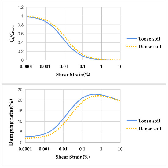 Figure 13 shows normalized shear modulus reduction and material damping ratio curves of loose soil and dense soil by Darendeli constitutive model in DEEPSOIL.