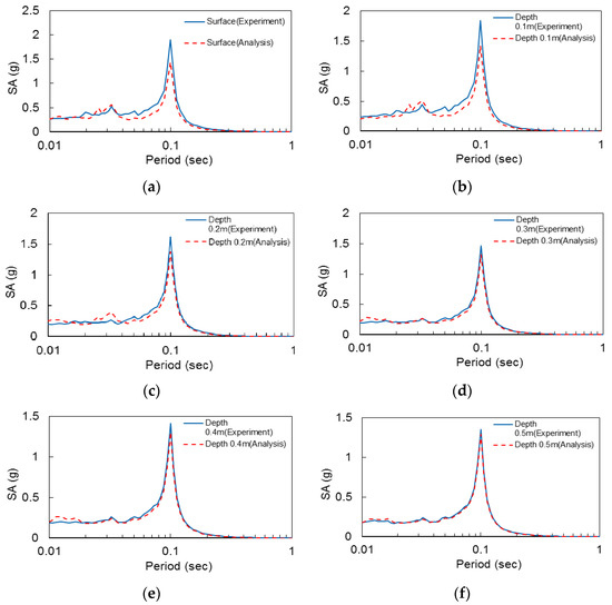 (a) SA by artificial wave at surface; (b) SA by artificial wave at 0.1 m depth; (c) SA by artificial wave at 0.2 m depth; (d) SA by artificial wave at 0.3 m depth; (e) SA by artificial wave at 0.4 m depth; (f) SA by artificial wave at 0.5 m depth.