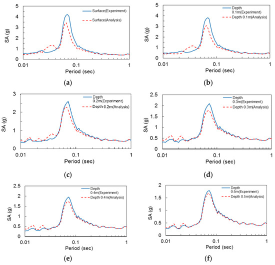 Figure 17 compares the experimental results and analytical values of the 1 g shaking table at different depths when the seismic wave is applied. The figure also shows that the 1D ground response analysis values of response spectral acceleration predict the experimental values well. The depth 0.3 to 0.5 m corresponding to dense ground has almost the same experimental value and analytical value. The response spectral acceleration of the depth surface to 0.3 m, which simulated the loose ground, was somewhat different from that of the dense ground, but overall it simulated the amplification well and predicted the main amplification cycle well. However, on the surface of the soft soil, the numerical analysis value is amplified less than the experimental value.