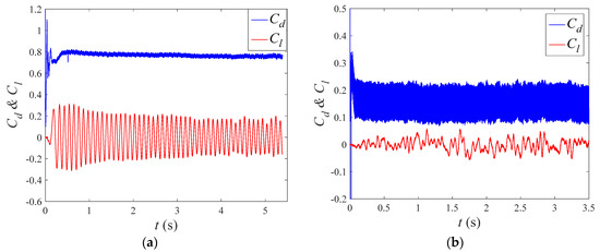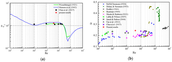 Through comparison and analyzation of the global parameter results, and were adopted in the final results discussion. Current results accompanied with some previous simulation and experimental results [26,27,28,29,30,31,32,33,34,35,36] for the flow around a single cylinder are shown in Figure 3. The mean drag coefficient versus Reynolds is shown in Figure 3a, and it can be observed that is very close to previous results at similar Re range. The in the previous 3D flow experiment is less than that in this paper at similar Re range. In the present 2D numerical simulation, the computational domain height is extraordinarily small, so the 3D flow in spanwise direction cannot be fully developed. Thus, the present results are closer to the 2D flow results [28,34,35], as shown in Figure 3b. From the previous comparison, it can be concluded that the present numerical model and grids are reliable and have good reference value for further research of TWW flow control.