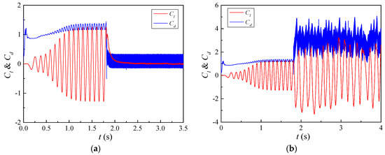 Characteristic values of lift and drag coefficient under different wave velocities. (a) . (b) .