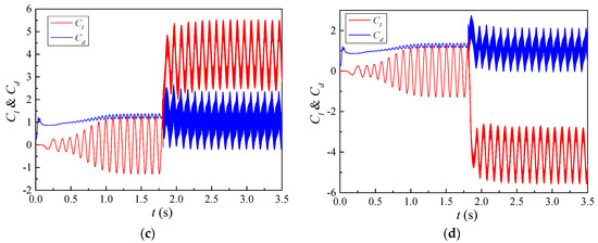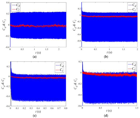 Lift and drag coefficient time history curves under various propagation directions. (a) Downstream. (b) Upstream. (c) Corotating-Clockwise. (d) Corotating-Counterclockwise.
