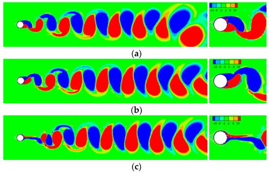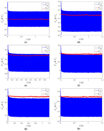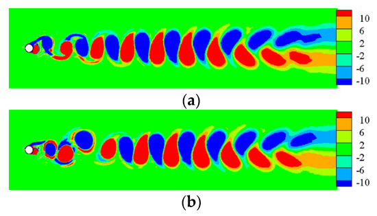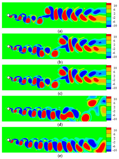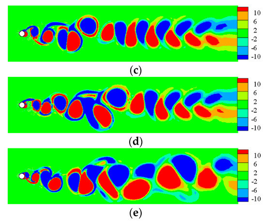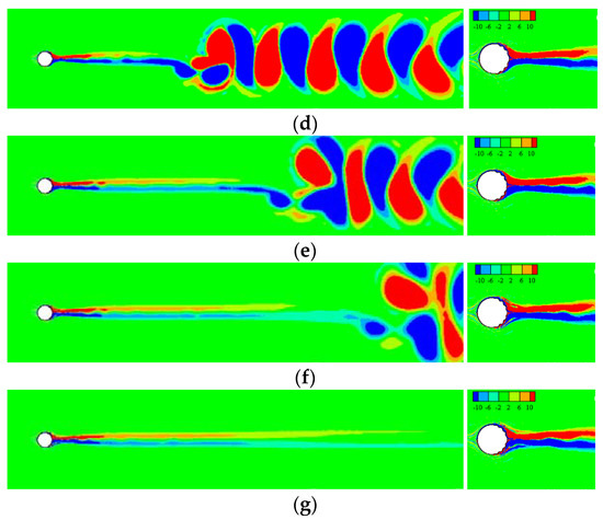 The vorticity contours surrounding TWW cylinder with “Downstream” propagation are shown in Figure 7. In the interval , the traveling wave was not activated, and the vortex sheds from both side of the cylinder alternately, as shown in Figure 7a. Figure 7b shows that the TWW activated shortly has little effects, and the separated free shear layer still rolls into vortices. Form Figure 7c–g, as time advanced, the control effect of TWW became more obvious, and the vortex street appeared in uncontrolled cylinder was eliminated. The shear layer detaches from the cylinder surface, and then enters the wake region without rolling into vortices due to the “fluid roller bearing” (FRB) effect of TWW, and the vorticity is distributed steadily and symmetrically in the cylinder wake region, which means that the TWW cut off the energy source for generating vortex. When , the TWW eliminates oscillating wakes of the cylinder successfully.