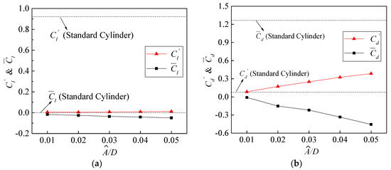 Wave amplitude should be taken as 0.02D to obtain the optimal control effect. At the wave amplitude ratio of 0.02, decreases dramatically to 0.005. When increases from 0.02 to 0.05, increases slightly, while dropped by 98.7% from the result of standard circular cylinder at . With the increase in , decreases from −0.010 to −0.456, and increases to almost 4.7 times the result of standard circular cylinder.