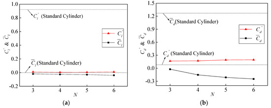 Figure 13 shows the characteristic values of lift and drag coefficient under different wave numbers, including the mean and RMS values of lift and drag coefficient. In Figure 13a, with the increase in N, decreases slightly from −0.019 to −0.039. almost hardly changes, whose values are between 0 and 0.01. It is observed that the fluctuating lift coefficient has been tremendously suppressed, however, different wave numbers have little impact on fluctuating lift coefficient after activating TWW, in comparison with the standard circular cylinder. Figure 13b shows that decreases to negative values and changes from 0.166 to 0.195 with the increase in N. It indicates that the cylinder′s reverse thrust increases gradually with the increase of N, and the wave number has some effect on .