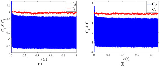 Lift and drag coefficient under different wave velocities. (a) . (b) . (c) . (d) . (e) . (f) . (g) . (h) . (i) . (j) .
