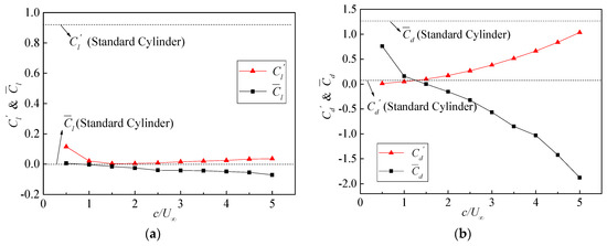 Figure 15 shows the characteristic value analysis of lift and drag coefficients under different wave velocities, including the mean and RMS values of lift and drag coefficients. In Figure 15a, with the increase of , changes from a result larger than that of standard circular cylinder to a result less than that of standard circular cylinder. As for the overall time, has little difference with that of standard circular cylinder in the range of the whole velocity ratios. As increases from 0.5 to 1.5, decreases dramatically from 0.115 to 0.003. In addition, reaches the minimum at , whose value decreases by 99.63% than that of standard circular cylinder. increases slightly from 0.005 to 0.036 as increases from 2.0 to 5.0. In addition, equals to 0.036 at , which achieves 96.09% reduction from the result of standard circular cylinder. In Figure 15b, with the increase of , decreases from 0.761 (60.04% of standard cylinder) to −1.8774, and increases from 0.014 to 1.037 (almost 12.8 times the result of standard circular cylinder). From the analysis results above, it is indicated that the velocity ratio is the optimal wave velocity for TWW flow control with respect to the control effect and energy input.