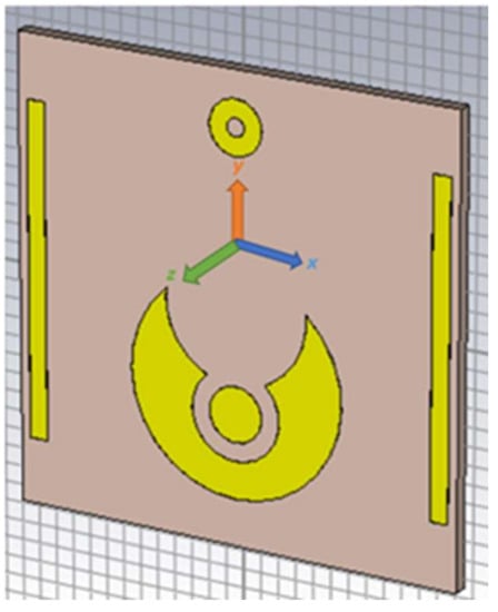 The coordinate system of metamaterials is shown in Figure 2. During the simulation process, the boundary settings were chosen as given: x-axis as an open boundary, y-axis as a perfect electric wall, z-axis as a perfect magnetic wall. Two ports were used for simulation: the first one was on the positive side of the x-axis, the other one was on the negative side of the x-axis. The simulation was processed using time-domain solver with an accuracy of −40 dB.